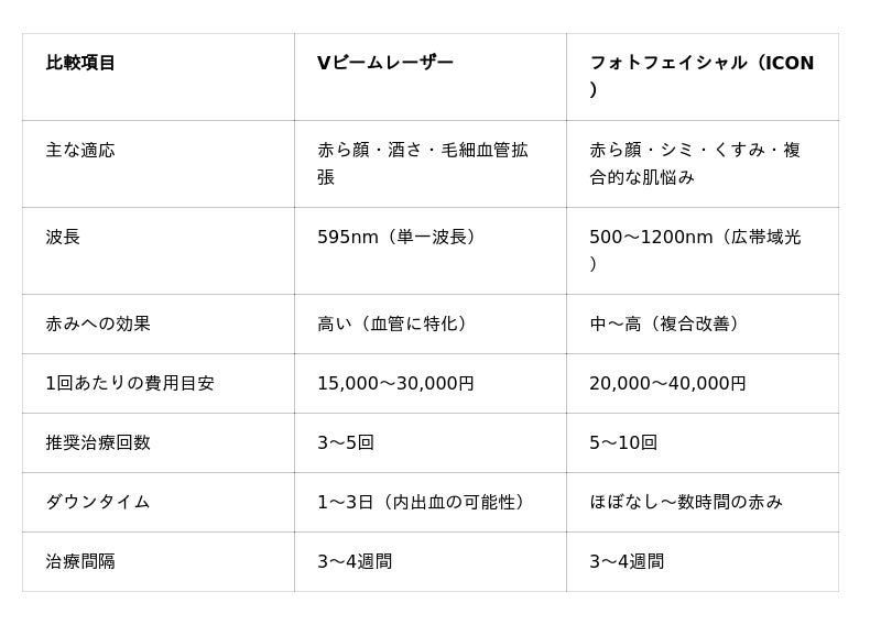 Vビームレーザーとフォトフェイシャル(ICON)の比較