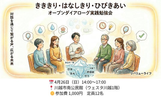 特定非営利活動法人リバリューライフ(所在地:埼玉県川越市)は、2026年4月26日(日)14:00~17:00、川越市南公民館(ウェスタ川越1階)にて「きききり・はなしきり・ひびきあい」(旧:オープンダイアローグ実践勉強会)を開催いたします。