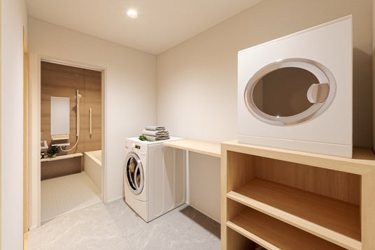 また、設備面では、ガス衣類乾燥機「乾太くん」、深型食洗機、太陽光発電、宅配ボックス、セカンド冷凍庫スペースなど、共働き世帯や子育て世帯の毎日を支える設備を採用。日常の家事や生活負担を軽減し、より快適な暮らしを実現する住まいを目指しています。