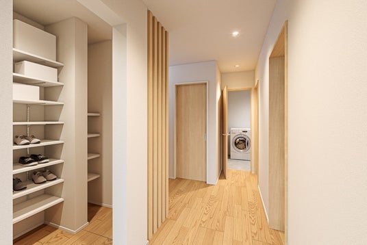 さらに、玄関から手洗い・クローゼット・脱衣室へつながる動線や、リビングへつながる回遊動線など、暮らしやすさを高める設計上の工夫も盛り込んでいます。