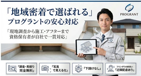 プログラント公式サイトでは、害獣・害虫対策に加え、完全自社施工、資格保有者対応、写真入り報告書、保証体制などが案内されています。