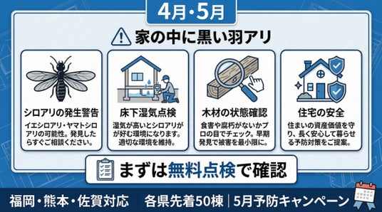 株式会社プログラント(本社:熊本県熊本市、代表取締役:藤井 靖光)は、ヤマトシロアリの羽アリが発生しやすい4月中旬~5月に合わせ、福岡県・熊本県・佐賀県を対象に「床下SOS・無料点検」を開始いたします。