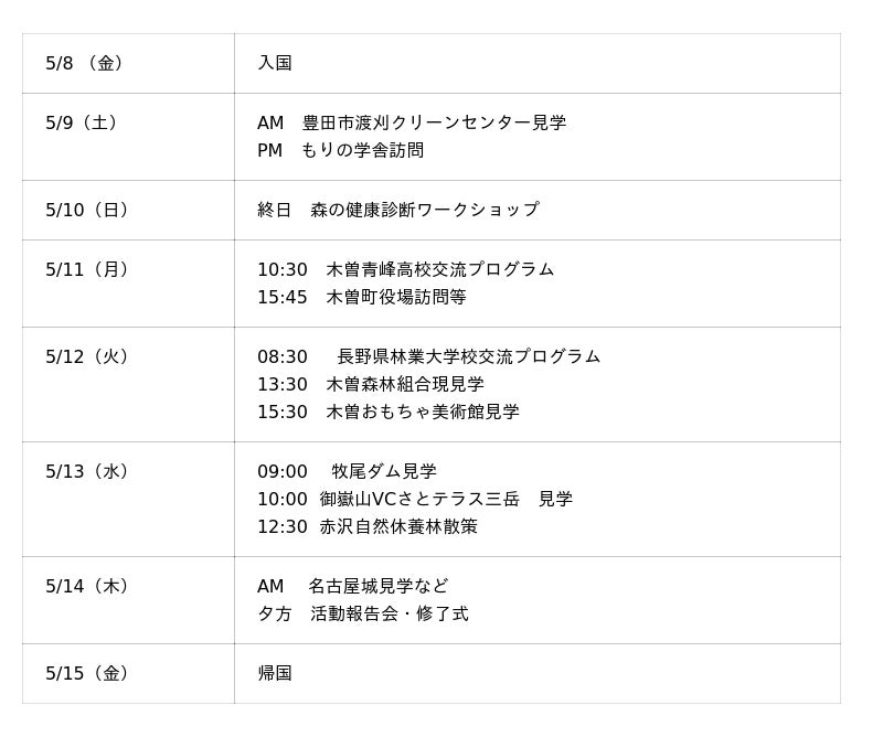 その一環として、5月11日(月)~13日(水)に長野県木曽町を訪問します。木曽町では、森林・林業を学ぶ生徒が在籍する長野県木曽青峰高等学校や長野県林業大学校での交流授業、森林組合の現場見学などを予定しており、交流を深めながら、日本の森林・林業の現場や森林教育の取り組みについて体験的に学びます。また、赤沢自然休養林の散策や牧尾ダムの見学などを通じて、森林が水を育み、流域の暮らしを支えていることや、森林とともに暮らしてきた地域の歴史・自然環境について理解を深めます。