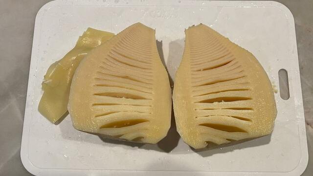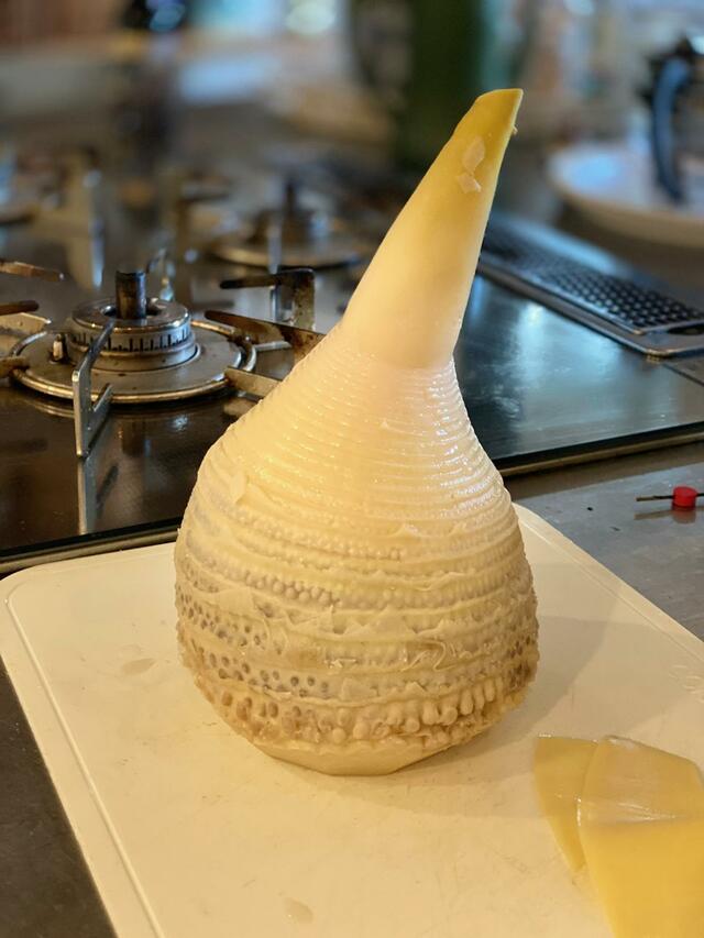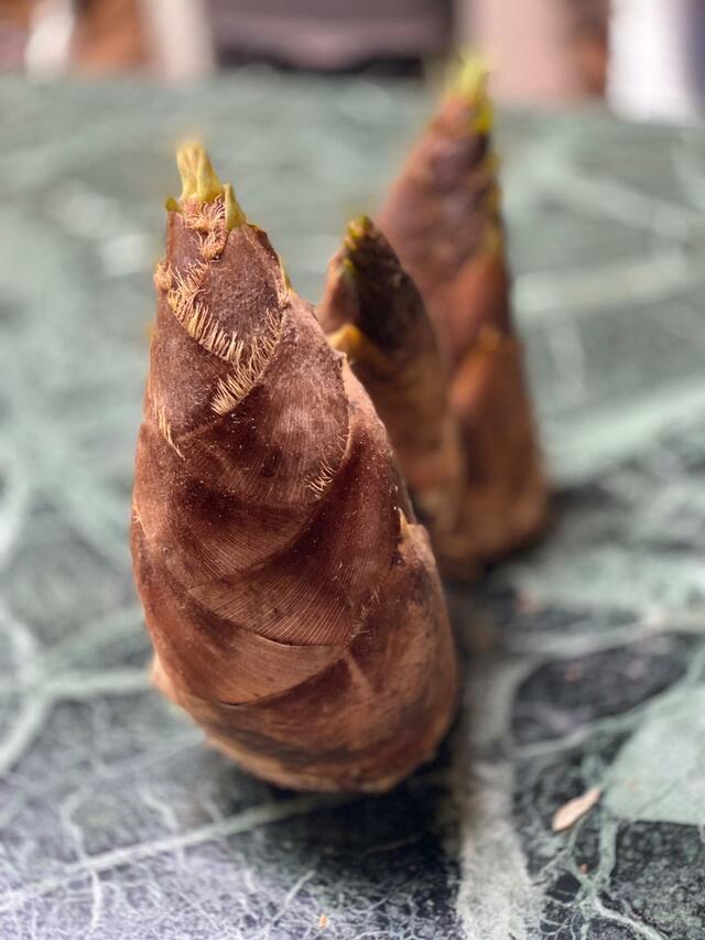 筍生活始まります。米ぬかと唐辛子で下茹で。冷まして皮を剥いた姿はこんな風。