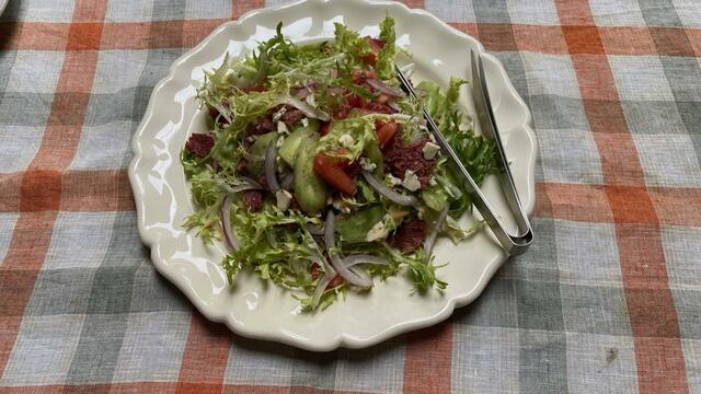 今日も寝坊してしまい、お昼からのスタートです。サラダ(フリゼレタス、コンビーフ、きゅうり、トマト、アーリーレッド)。