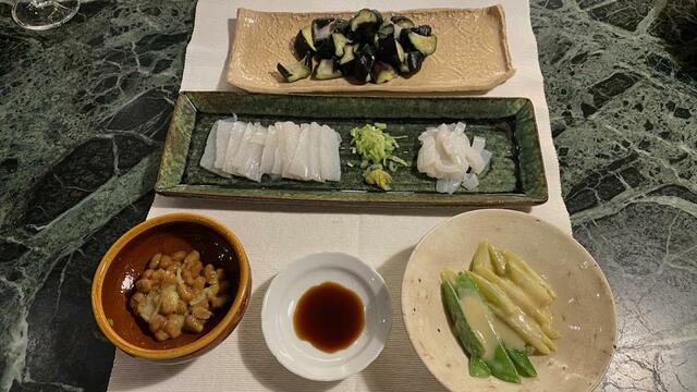 他にはヤリイカの刺身、納豆、蕗の酢味噌あえ。
