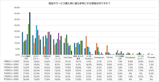 「商品やサービス購入時に最も参考にする情報」については、全体では「テレビ番組・CM」が最も高く、次いで「口コミ・レビュー」「企業公式サイト」と続きました。