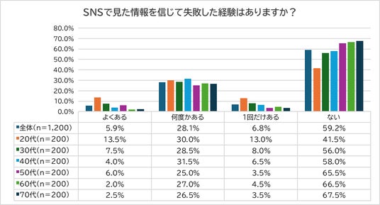 「SNSで見た情報を信じて失敗した経験」については、全体の約4割が何らかの経験を持っていることがわかりました。