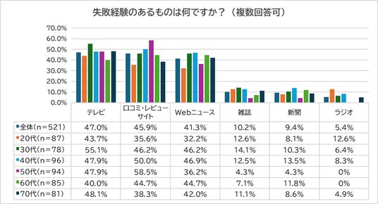 「具体的にどの媒体で失敗したか」を見ると、「テレビ」「口コミ・レビューサイト」「Webニュース」が上位に挙がりました。