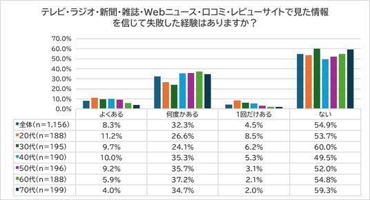 SNS同様「テレビ・ラジオ・新聞・雑誌・Webニュース・口コミ・レビューサイトで見た情報を信じて失敗した経験」ついても、全体の4割超が経験ありと回答しました。