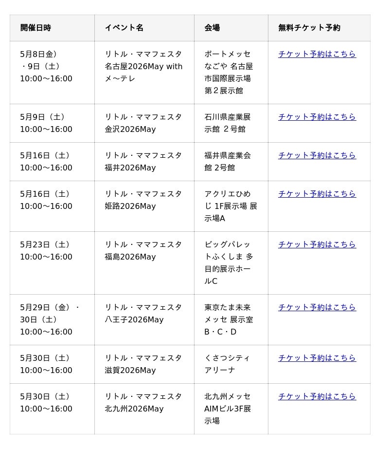 子育て世帯を中心に、親子で楽しめる体験や地域交流への関心が高まるなか、国内最大規模の親子フェスタを開催する株式会社エンファム.(東京本社:東京都港区、福岡本社:福岡県福岡市、代表取締役:森 光太郎)は、5月8日(金)・9日(土)名古屋、5月9日(土)金沢、5月16日(土)福井・姫路、5月23日(土)福島、5月29日(金)・30日(土)八王子、5月30日(土)滋賀・北九州の8都市にて、親子向けイベント「リトル・ママフェスタ」を開催いたします。ママ・パパとお子さまとの『思い出づくりの場』として、ご家族皆様でお楽しみください。