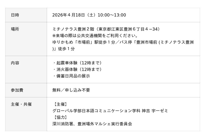 武蔵野大学(東京都江東区、学長:小西 聖子)のグローバル学部日本語コミュニケーション学科 神吉 宇一ゼミは4月18日(土)に、ミチノテラス豊洲で地域防災イベントを実施します。