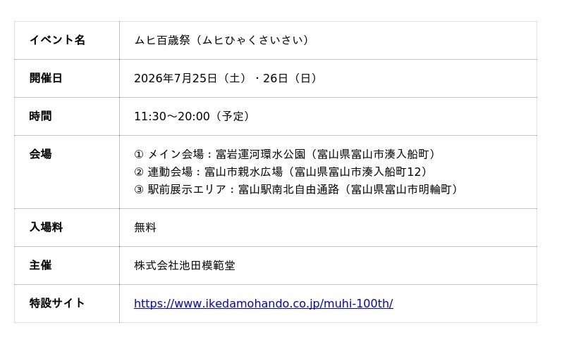 かゆみ止め薬「ムヒ」を製造・販売する株式会社池田模範堂(本社:富山県上市町、代表取締役社長:池田嘉津弘、以下「当社」)は、「ムヒ」の発売100周年を記念し、富山県で記念イベント「ムヒ百歳祭(ムヒひゃくさいさい)」を2026年7月25日(土)・26日(日)に開催いたします。