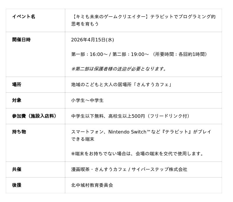 サイバーステップ株式会社が開発運営するみんなで作るサンドボックスゲーム『テラビット』は、2026年4月15日(水)に地域のこどもと大人の居場所「さんすうカフェ」(沖縄県北中城村)と共催で、小中学生向けのゲーム制作体験イベントを開催することをお知らせします。