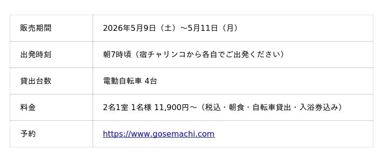 宿チャリンコ公式サイト :https://www.gosemachi.com/charinko/