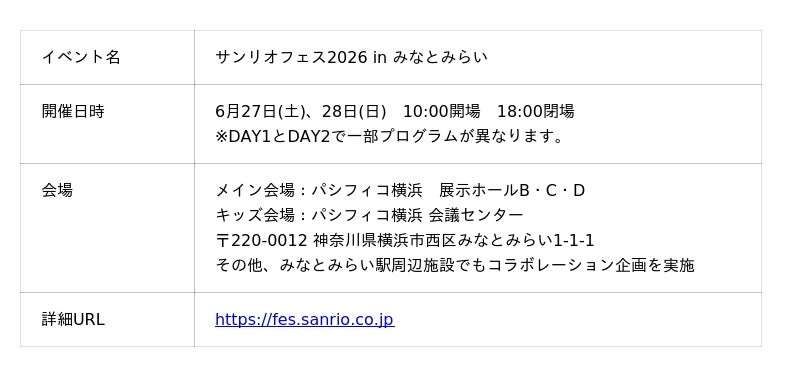 「サンリオフェス2026 in みなとみらい」特設サイトオープン!チケット販売情報も公開