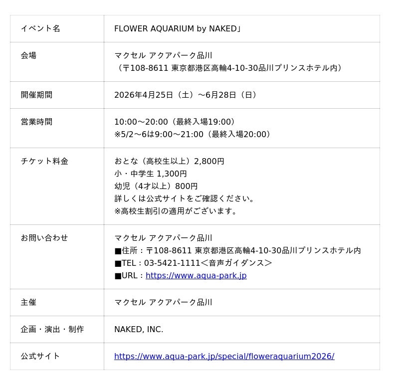 株式会社ネイキッド(英語表記:NAKED, INC.、所在地:東京都渋谷区、代表:村松亮太郎)は、マクセル アクアパーク品川にて開催する、初夏限定イベント「FLOWER AQUARIUM by NAKED」の企画・演出・制作を手がけています。
