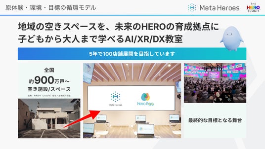 株式会社Meta Heroesは「Society 5.0 × SDGs × HERO」をテーマに事業を展開。主にメタバース(XR)やAIを活用した開発やDX教育施設『Hero Egg』の運営、そして半年で15000名を超えるAIの企業研修を行うと同時に教育・防災・地方創生など社会課題の解決に取り組む企業です。