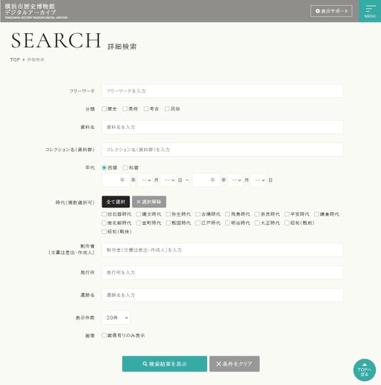 キーワード検索/詳細検索・資料名・コレクション名から検索・分類(歴史・美術・考古・民俗)を絞って検索