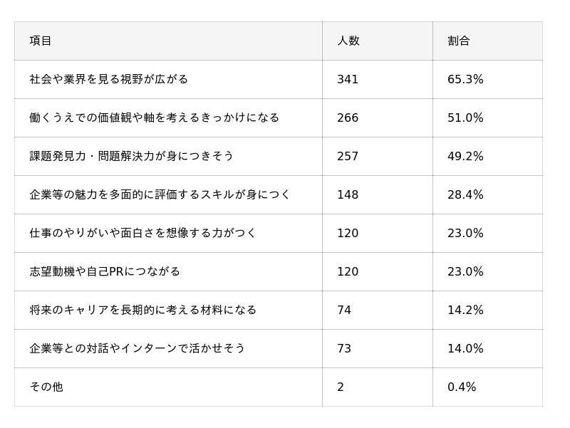 「非常に役立つと思う」または、「ある程度役立つと思う」と回答した522名にその理由を聞いたところ、「社会や業界を見る視野が広がる」(65.3%)、「働くうえでの価値観や軸を考えるきっかけになる」(51.0%)、「課題発見力・問題解決力が身につきそう」(49.2%)と、キャリア観の形成に関わる項目が多く挙げられました。(表8)