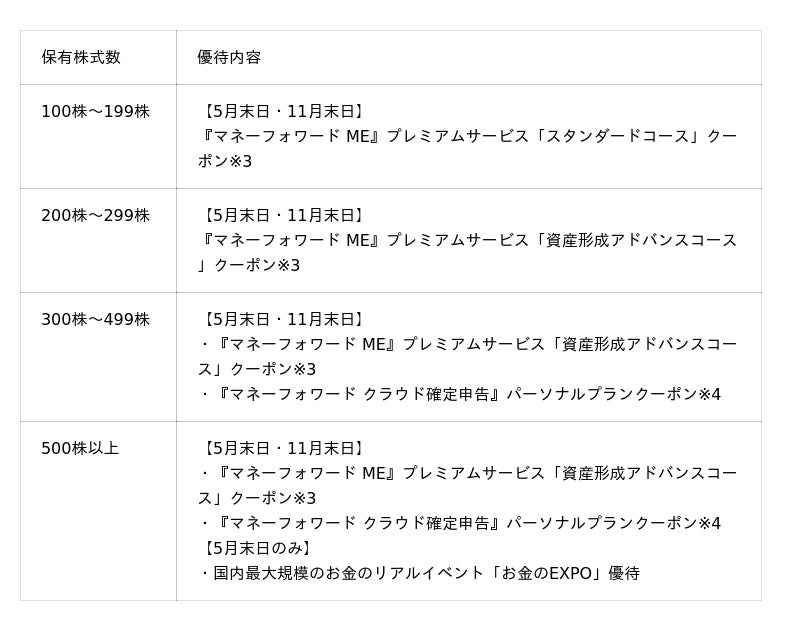 100株以上の保有で『マネーフォワード ME』プレミアムサービスクーポンを提供。株主の皆さまの資産形成を支援