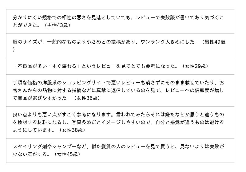 口コミ情報で「買うことを決めた」「評判がよい方を買った」「買うことをやめた」が各3割強と、口コミ情報が商品やサービスの購入に影響していることがうかがえます。