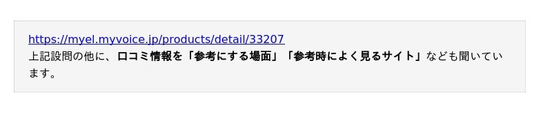 ネット上の口コミ情報の参考状況や影響、自由記述にて参考になった経験などについて聞いています。調査結果をお知らせいたします。