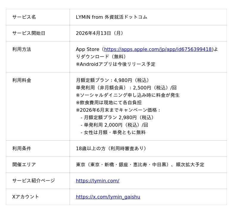 株式会社ハウテレビジョン(本社:東京都港区、代表取締役:音成洋介)は、国内初の完全審査制ソーシャルダイニングサービス(※1)「LYMiN from 外資就活ドットコム」(以下「LYMiN」、読み:リミン)を4月13日(月)より提供開始いたしました。本サービスはiOSアプリで利用可能です。