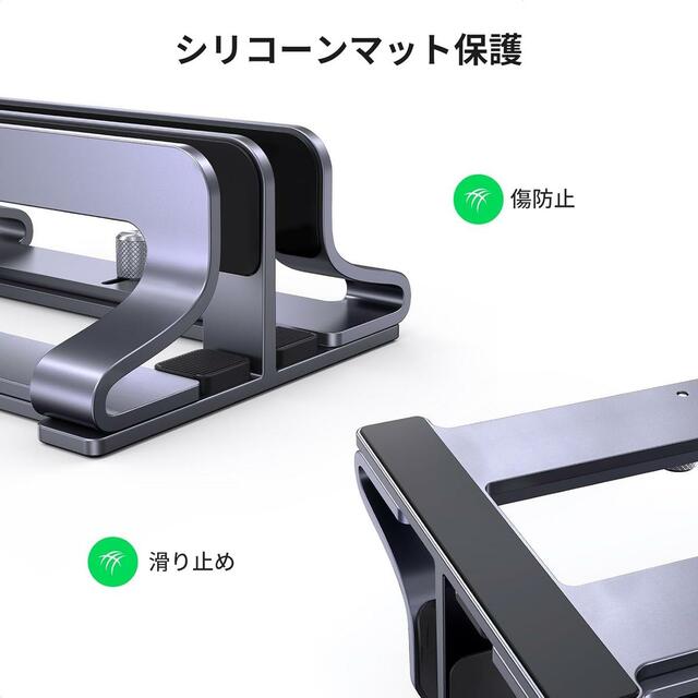 素材は頑丈なプレミアムアルミニウム合金製を採用し、安定性も抜群。スロットの内側はシリコンパッドで保護されており、大切なノートPCが傷つく心配もありません。
