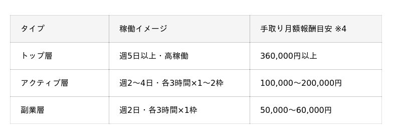 - 副業を探しているホワイトカラー層 :週1~2回、自分のペースで高単価の副業として