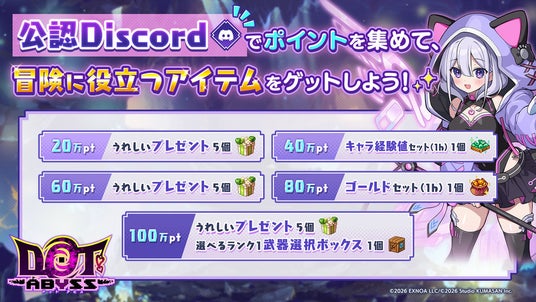 『ドットアビス』公認Discordでは編成の相談などプレイヤー同士の交流の場として活用できます。さらに、公認Discordでポイントを集めると、冒険に役立つアイテムをゲーム開始時にプレゼントいたしますので、この機会にぜひご参加ください。