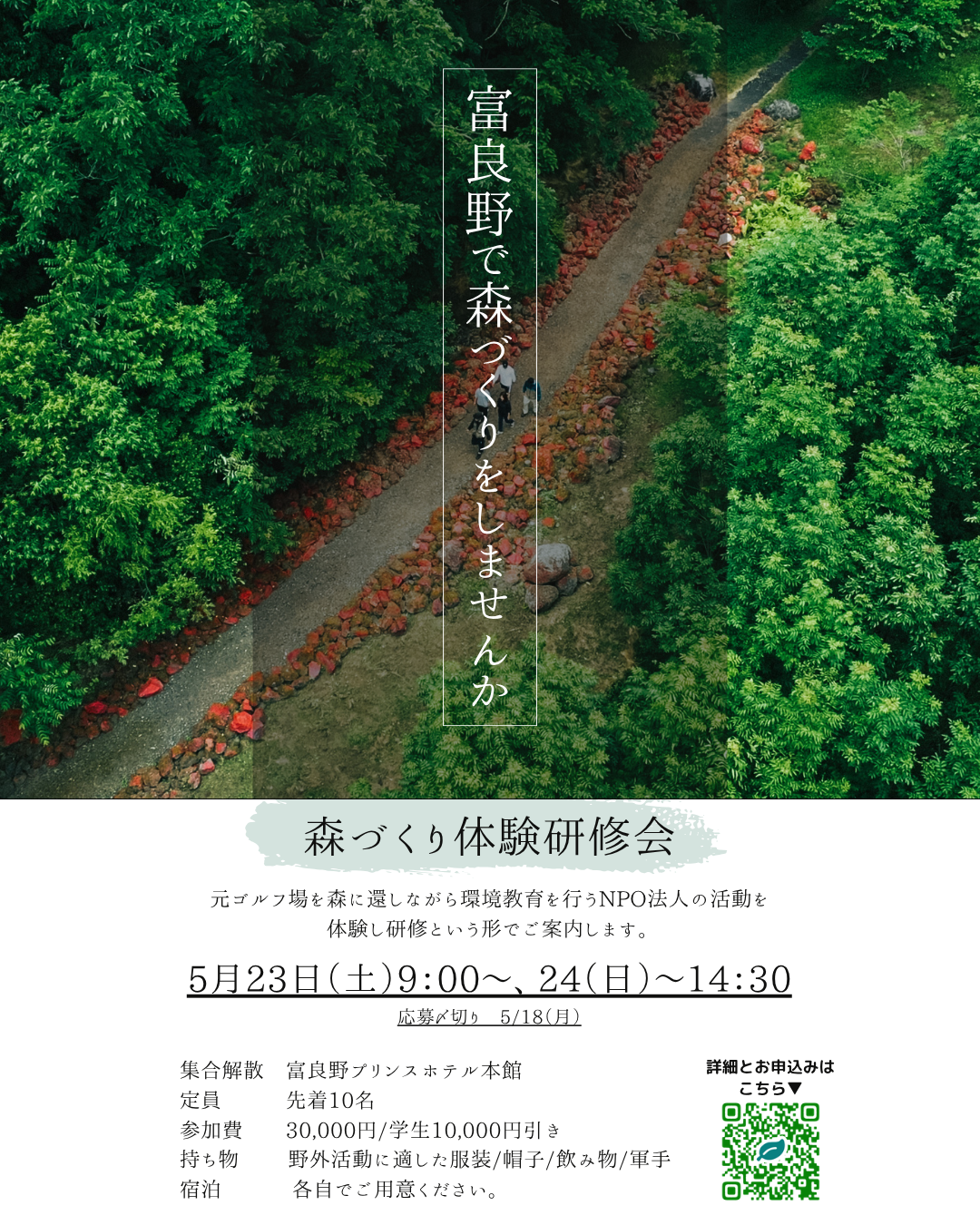 本企画は、富良野自然塾を持続可能にしていくための取り組みです。まずは取り組みを知っていただき、仲間を募り、森づくりのノウハウと環境教育の手法などを体験していただきたく、開催を決定しました。なので、体験型の研修会という形式を取らせていただきました。少しでも自然や森、生き物、環境などに興味のある方はご参加いただいて、我々が伝えられることは持って帰っていただけると幸いです。