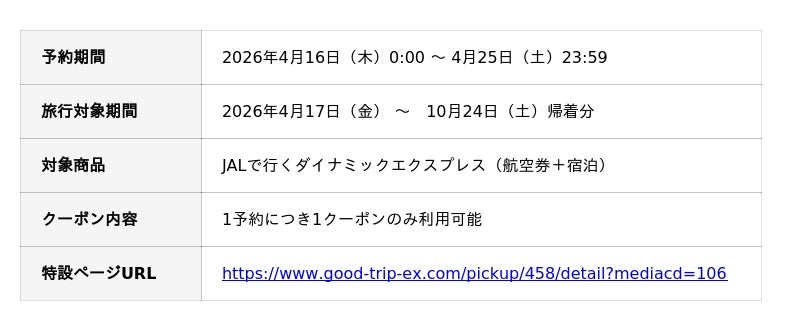 日本空輸株式会社(本社:東京都港区、代表取締役:岡下 敏也)が運営する旅行予約サイト『グッドトリップエクスプレス(グットリ)』は、 会員様限定で、航空券と宿泊を自由に組み合わせられるダイナミックパッケージが最大35,000円OFFとなる「JALで行く春旅セール」を、2026年4月16日(木)から4月25日(土)までの10日間限定で実施します。本セールでは、ご旅行代金の合計金額に応じて利用できる、6種類の特別クーポンを配布します。今すぐ行きたい直近の旅行からGWや夏休み・秋の連休など、10月24日帰着分までが対象の短期間特別セールです。高額なご旅行ほど割引額が大きくなるため、ご家族やグループでの少し贅沢な旅をするなら、今が見逃せないチャンス!