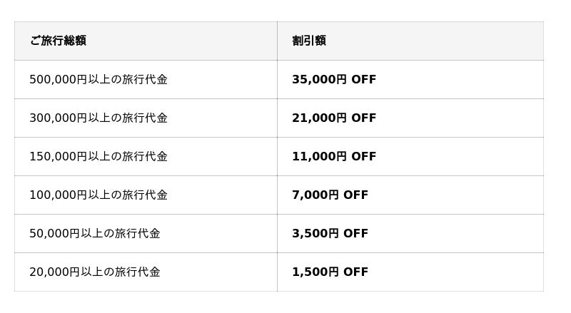 旅行金額に応じて割引額が引き上がる「ステップアップ型クーポン」の配布。ご家族やグループで長期滞在や憧れのホテルへの宿泊など、普段より少し贅沢な旅を検討されているお客様ほどメリットを感じていただける内容となっております。