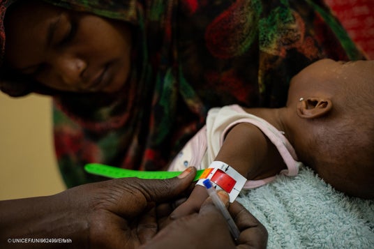 ジャジーラ州の保健センターで、上腕計測メジャーを使った検査により栄養不良を意味する「赤」が示された子ども(スーダン、2026年3月16日撮影) (C) UNICEF/UNI962499/Elfatih