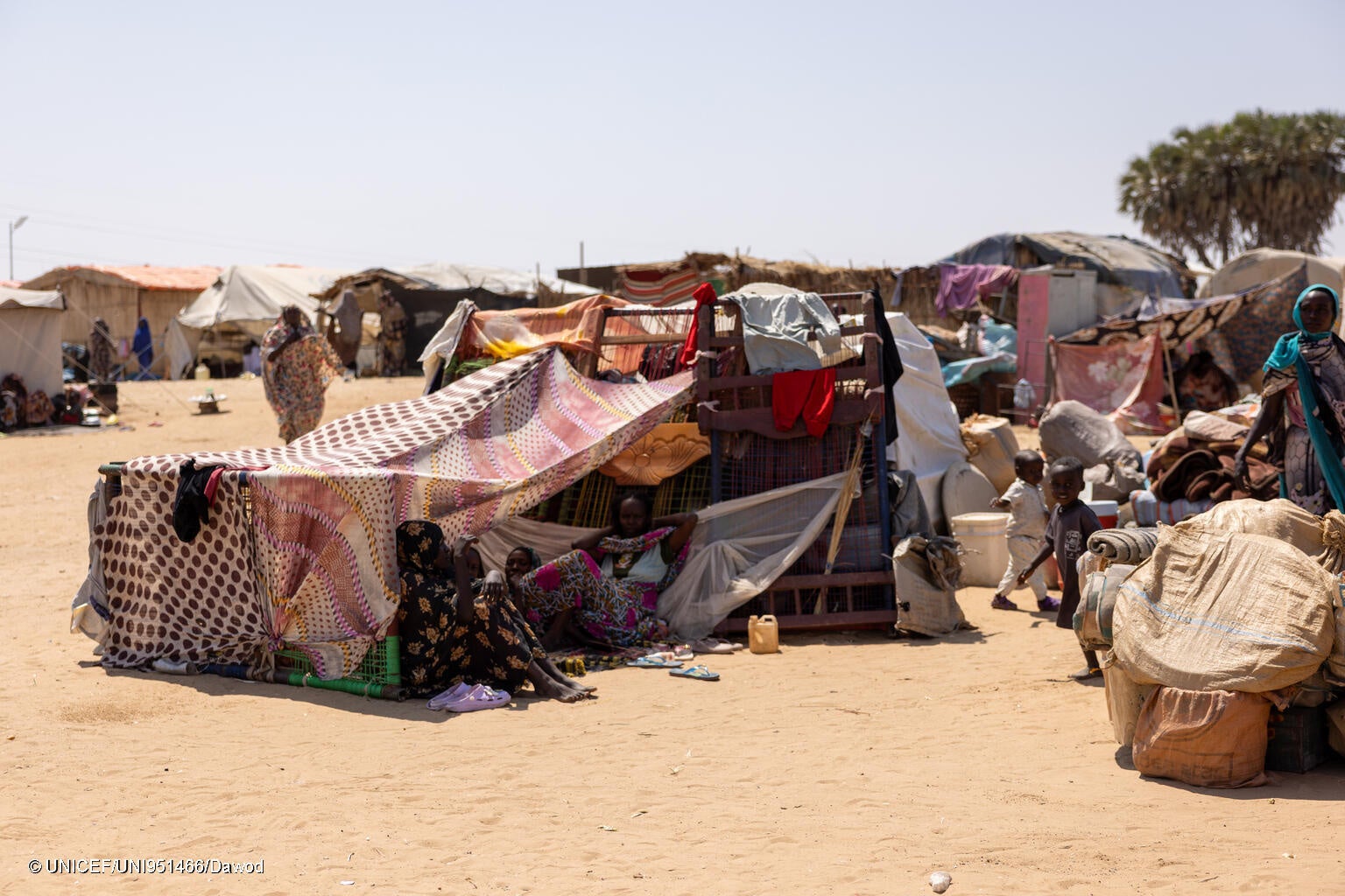南コルドファン州カドクリから、白ナイル州のゴズ・アルサラーム国内避難民キャンプまで逃れてきた親子。母親のハリマさんは、7人の子どもを連れて、21日間歩きたどり着いたという(スーダン、2026年2月15日撮影) (C) UNICEF/UNI954445/Dawod