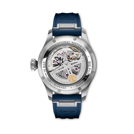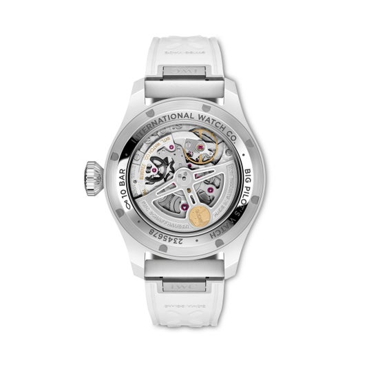 . 「ビッグ・パイロット・ウォッチ・パーペチュアル・カレン ダー・プロセット“プティ・プランス”」(Ref. IW339601) は、直径43 mm、ホワイトの酸化ジルコニウム・セラミッ ク製ケースと、グラデーション仕上げが施されたディー プブルーの文字盤を備えています。文字盤の数字とインデックスはホワイトでプリントが施され、ロジウムメッキの針にはスーパールミノバがコーティングされています。 この時計に組み合わされるのは、EasX-CHANGEシステ ムを装備したホワイトのラバー・ストラップです。