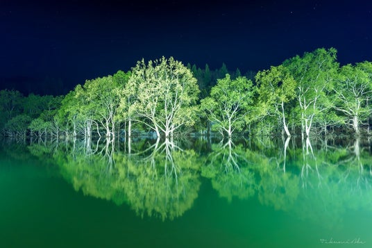 月とライトで浮かび上がる水没林