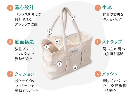 愛犬の移動時の負担軽減を考えたケアリーバッグの主な特徴