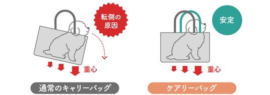 ケアリーバッグは、犬の骨格や重心バランスを考え、移動中でも愛犬が安心してくつろげることを目指して開発されたドッグキャリーです。通院や外出など、日常のさまざまなシーンで愛犬と飼い主の快適な移動をサポートします。