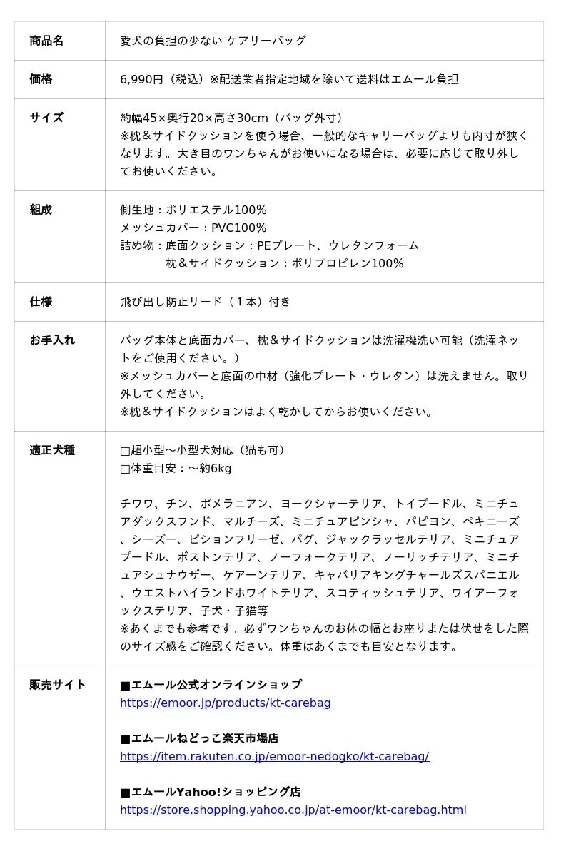 健康家具のD2C×EC事業を展開する株式会社エムール(東京都立川市:代表取締役 高橋 幸司)が運営する、愛犬愛猫専用寝具ブランド『エムールねどっこ』は、2026年4月13日より『愛犬の負担の少ない ケアリーバッグ』(以下、ケアリーバッグ)の販売を開始しました。