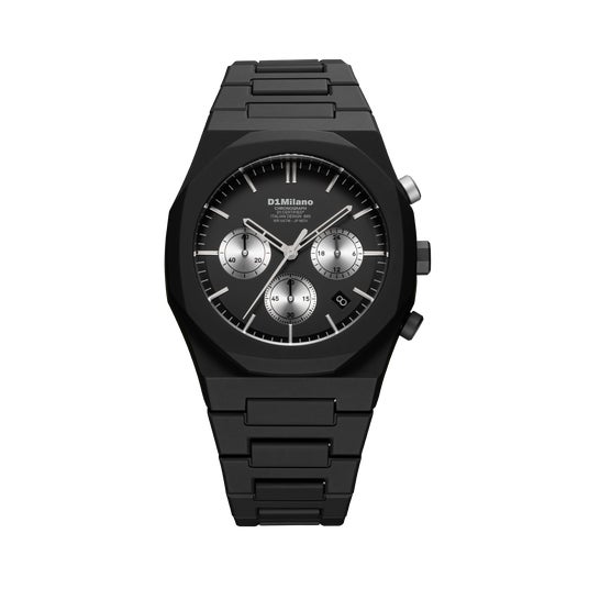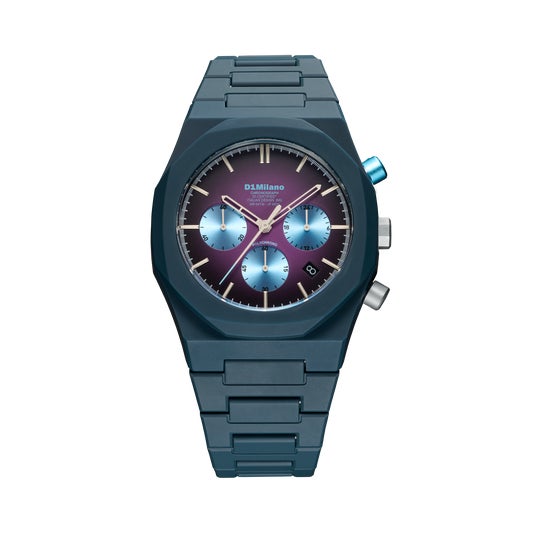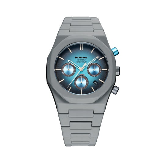 POLYCHRONOは、D1 Milanoの特徴であるミニマルデザインをベースに、クロノグラフ機能を搭載したスポーティなモデルです。ダイヤルにはクロノグラフ特有のサブダイヤルを配置しながらも、ブランドらしいクリーンなデザインバランスを保ち、ファッションウォッチとしての洗練された印象に仕上げています。スポーティでありながら日常のスタイリングにも取り入れやすく、カジュアルからストリートスタイルまで幅広いコーディネートに対応するモデルです。