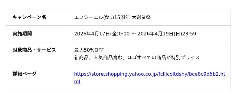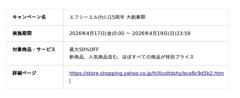 エフシーエル(fcl.)が15周年を記念し、Yahoo!ショッピング「爆買WEEK」にて最大50%OFFセールを4月17日より開催。