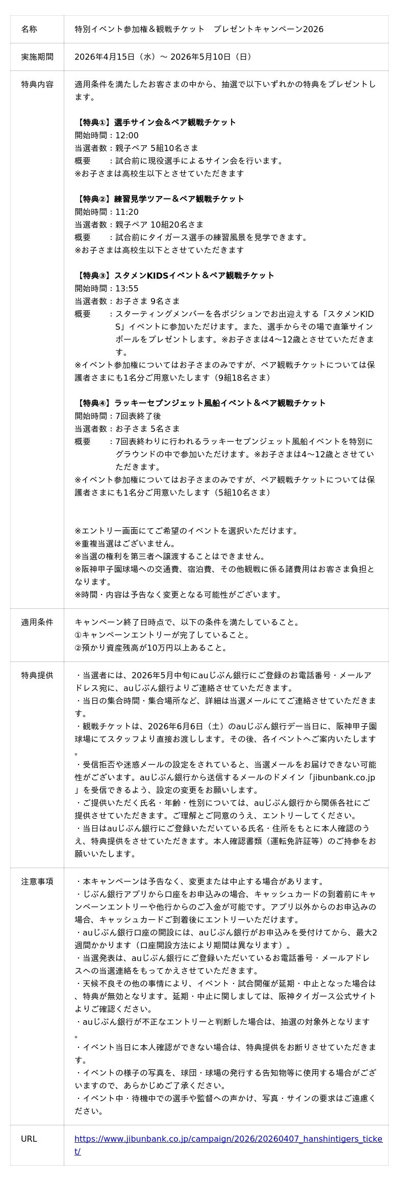 auじぶん銀行株式会社(本社:東京都中央区、代表取締役社長:田中 健二、以下 auじぶん銀行)は、2026年6月6日(土)に阪神甲子園球場で開催される阪神タイガースVS東北楽天ゴールデンイーグルス戦に協賛し、冠協賛試合「虎党のお財布 auじぶん銀行デー」を開催します。
