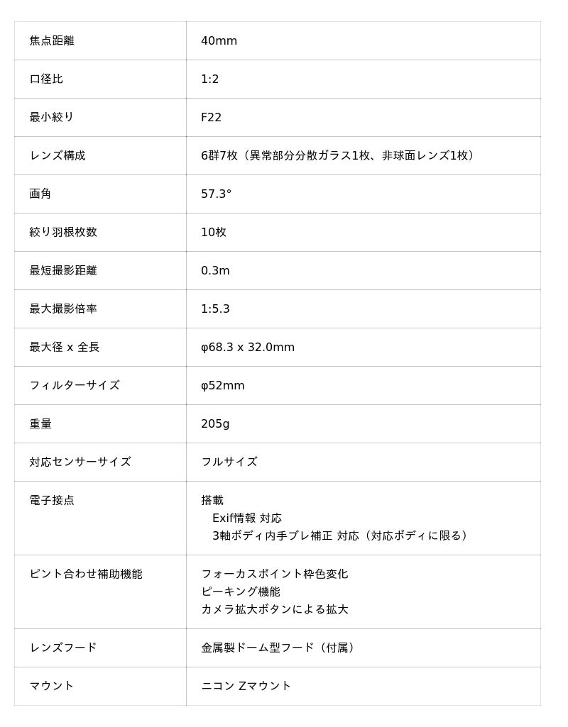 本製品は、ミラーレスカメラにマッチしたコンパクト性を備えたパンケーキタイプの標準レンズです。フルサイズZマウントセンサー(ニコンFXフォーマット)に最適化され、6枚構成のオルソメタータイプをベースに非球面レンズ1枚を追加することで7枚構成とし、光学系を小型化できるオルソメタータイプのメリットを維持しながらF2という明るさを実現。オルソメタータイプの特長として歪曲収差が極めて少なく、直線のモチーフに対して歪みを感じさせることなく描き切ることのできるレンズです。