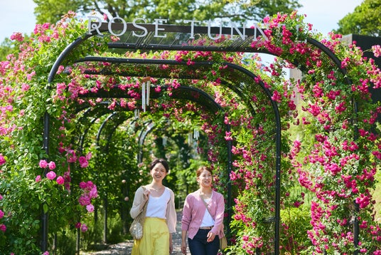 オリジナルのバラである鮮やかなピンク色の「ユイット・カンパーニュ」から始まる豊かな香りに包まれる12色の「バラのトンネル」、丘上に広がるバラテラス。11色100品種の「色別バラ」エリアや、5種類の香りに大別された「香りのバラ」エリアなど、五感で楽しむことができる園内となっております。