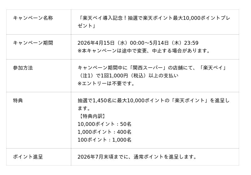 本キャンペーンでは、キャンペーン期間中に「関西スーパー」の店舗にて「楽天ペイ」(注1)で1回の買い物で1,000円(税込)以上の支払いをした方の中から、抽選で1,450名に「楽天ポイント」最大10,000ポイントを進呈します。