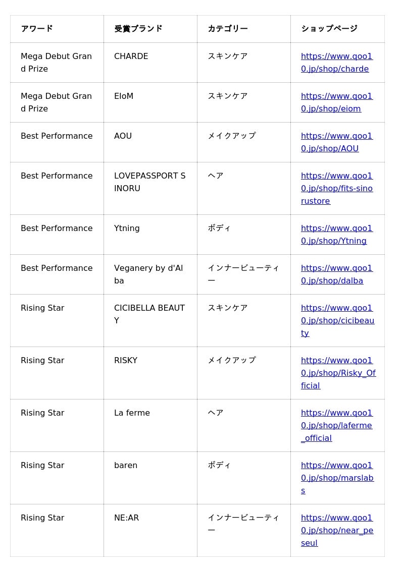 ■「2026 Qoo10 メガデビュー アワード」受賞結果