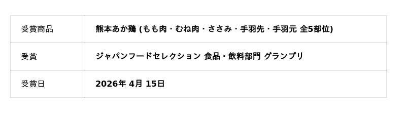 この度、やまうちフード株式会社(本社:熊本県山鹿市 取締役社長:岡本浩司)が販売する銘柄鶏「熊本あか鶏」が、2026年4月、2万3千人のフードアナリストが審査する国内最大規模の食品審査機関「ジャパンフードセレクション」において、もも肉・むね肉・ささみ・手羽先・手羽元の5部位すべてで最高位の【グランプリ】を受賞いたしました。