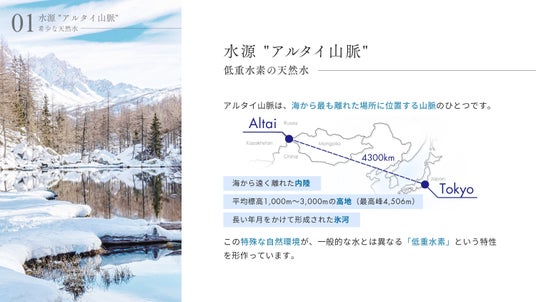 ― アルタイ山脈の氷河が生んだ自然由来で重水素濃度135(±5)ppmの希少な天然低重水素水。非加熱処理・無添加、PFOS・PFOA基準もクリアした天然水を、日常の水分補給に。 ―
